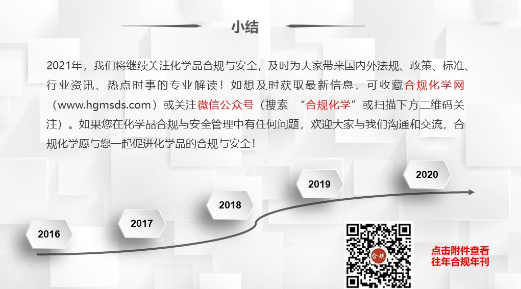 2020年,合规化学遵照以前的传统,对新发布的法规政策、化学品管理的常见问题、化学品相关的时事热点等进行科普、解读。现将2020合规年刊分享给大家,点击附件免费下载!