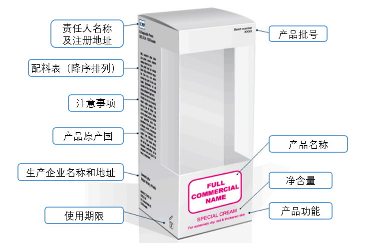 其中如果产品净含量不大于15g或15ml,仅需展示:产品中文名称、特殊化妆品注册证书编号、注册人或者备案人的名称、净含量、使用期限等;其余信息可在产品说明书中标注。