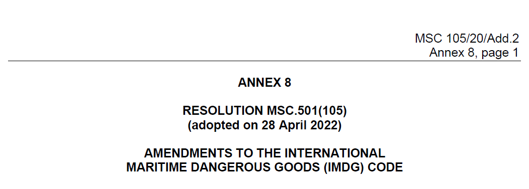 2022年4月28日,国际海事组织海上安全委员会(MSC)第105次会议通过了IMDG 41-22修正案。根据MSC.501(105)号决议,IMDG 41-22修订版于2023年1月1日起自愿实施,于2024年1月1日起强制实施。