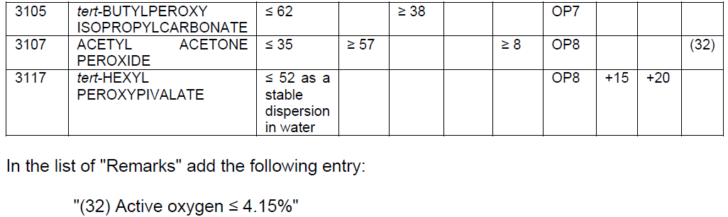 其中,根据新增的备注32,要求本次新增的过氧化乙酰丙酮(ACETYL ACETONE PEROXIDE)配置品的有效氧含量≤4.15%。