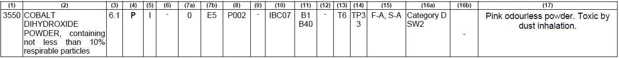根据EU 注册数据显示,氢氧化钴粉末 LC50(吸入,粉尘,4h)<0.2mg/L。按此数据氢氧化钴应划分为第6.1类吸入毒性固体,PG I(类别 1)。结合吸入毒性的分类方法:在评估急性吸入毒性时,固态物质至少 10%可能是可吸入范围内的粉尘(即粉粒的气体动力学直径为10um 或更小),才需要进行测试。因此,新增的UN3550仅适用于可吸入颗粒不少于10%的精制氢氧化钴,对于其它氢氧化钴还是可以按照UN3077运输。这样做既控制了可能的风险,又给予了行业运输的方便。