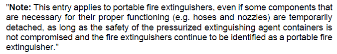 表明即使便携式灭火器正常工作所必需的一些部件(例如软管和喷嘴)被暂时取下,但只要加压灭火剂容器的安全不受影响,并且灭火器继续标为便携式灭火器,便可适用本条目。