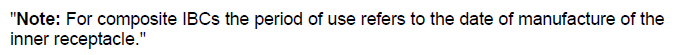 根据图1所示的备注要求,复合IBC的使用周期,应该从内贮器的生产日期开始计算,通常最多可以使用5年,除非有主管当局的批注。