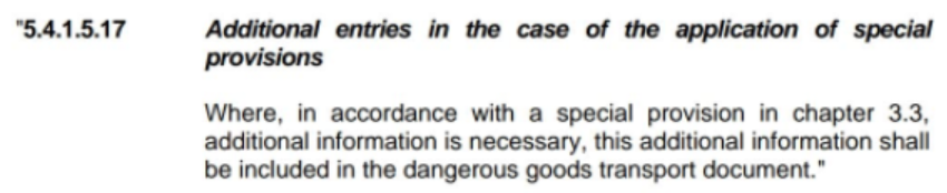 删除原来只针对UN3528,3529和3530的规定,将此节修订为针对所有具有特殊要求的物质。若第3.3章危险货物一览表有特殊规定要求额外情况,则都应该记录在运输单证上,而非仅仅UN3528,3529和3530。