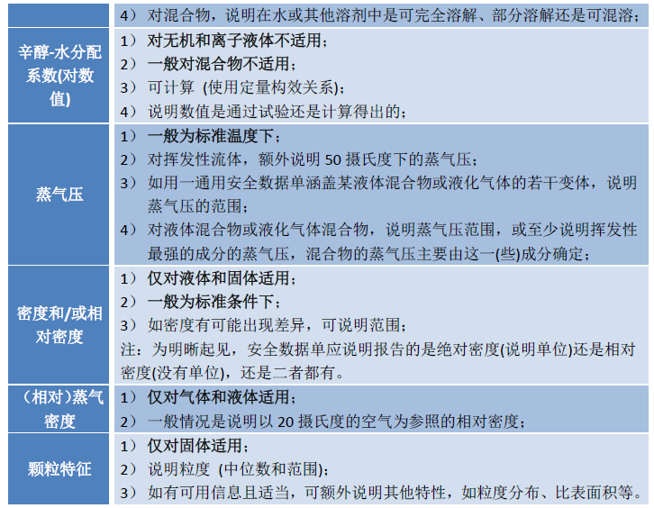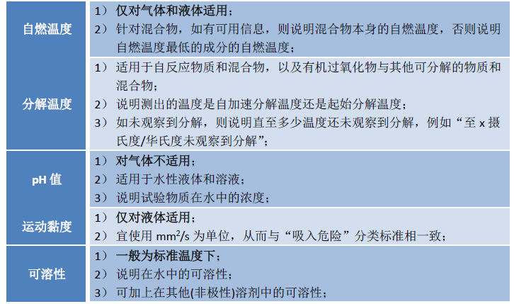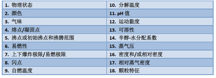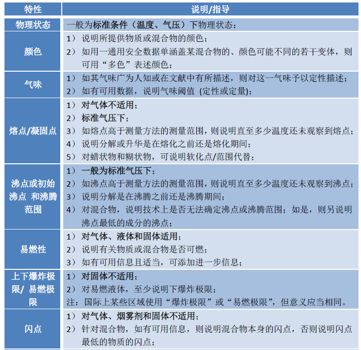 Ø 除表1所列的18项特性外,其他适当的物理或化学参数或安全特征也可载于安全数据单的这一部分;