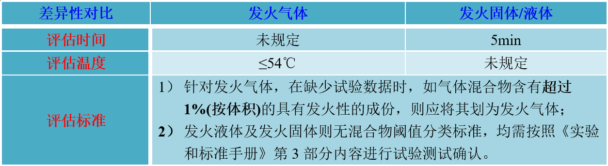 作为参比对象,GHS已有的第9和第10项物理危害:发火液体和发火固体是指即使数量小也能在与空气接触5min之内引燃的液体或固体。因此,从定义中不难发现,发火气体跟之前已有的发火固体和液体有明显区别,具体如表1所示。