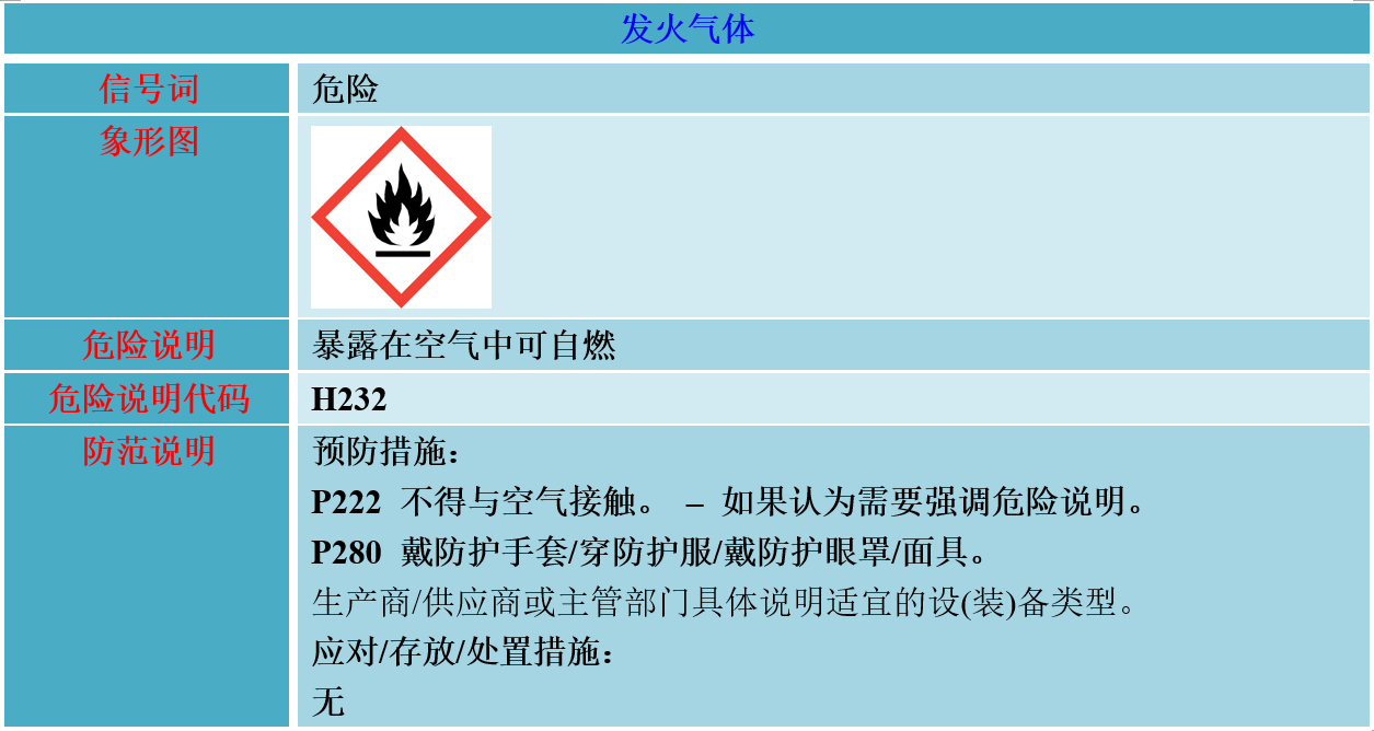 因此,当某易燃气体或其他混合物被划入“发火气体”时,按照GHS新规定,需要将该物理危害公示于安全数据单(SDS)中,同时将相关GHS标签要素加入其中。