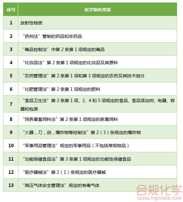 和K-REACH法规类似,CCA法规也有其适用范围。根据CCA法规规定,以下13类化学品不适用于CCA法规。