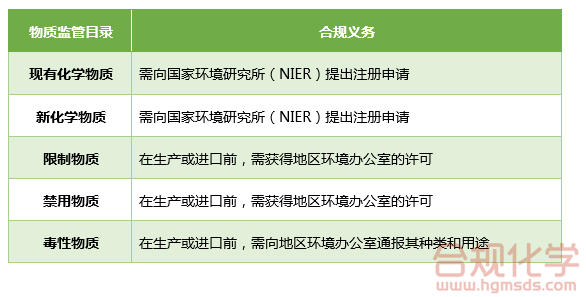根据CCA法规的管理规定,化学品的生产商或进口商需要根据拟化学品物质性质和使用环节的不同,履行不同的义务,具体如表1所示。