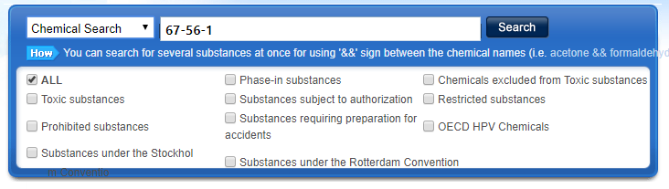 通过上下游的化学品信息传递(包括SDS),明确化学品中所有物质的名称和CAS号,形成一份详细的产品中化学物质成分清单。登录韩国国家化学品信息网站(NCIS, http://ncis.nier.go.kr/main/Main.jsp),通过物质英文名称或CAS号,明确产品中每一种化学物质的监管状态,具体查询界面如图1所示。