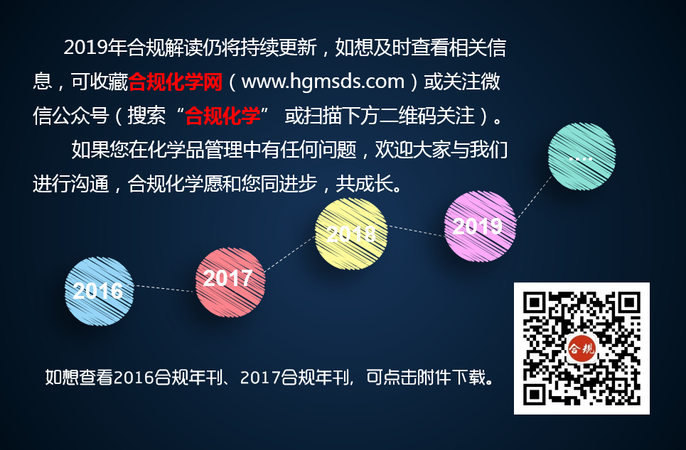 三年前,合规化学用自己的技术和情怀开始了原创解读。得益于每一位读者、企业朋友的支持与认可,我们有了持续更新的动力。截止目前,合规化学已经完成了百余篇原创文章。每年的合规年刊汇集了对行业内本年度的热门话题、焦点法规的科普和相关法规/技术解读,并在每年的年末拿出来与大家免费分享。它就像年夜饭一样,成为每年必不可少的一场化学品合规领域的饕餮盛宴。