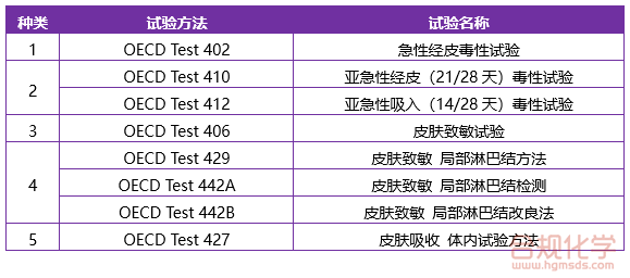如表4所示,Test 430只能区分化学物质是否有皮肤腐蚀性,是否属于第1类,但无法区分子类别;Test431不仅可以区分类别1,还能区分子类别1A,但无法区分子类别1B和1C;Test435则可以完全区分3个子类别;Test 439主要针对皮肤刺激,但如果试验结果显示不属于类别2,需要结合其他试验数据,才能判断是否属于类别3。