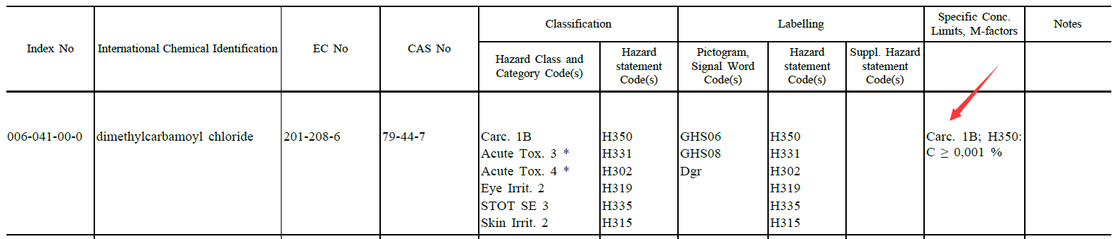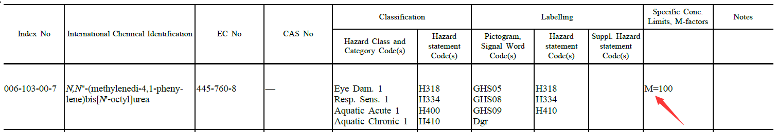 ② 如果组分列入统一分类表(CLP法规附件VI第3部分),且有M值,则表1中的环境危害浓度限值需要根据环境危害分类的M值计算公式,做调整。