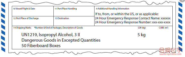 EQ包件的货运单或提货单上除了需满足常规危险货物托运的填写要求外,还需注明“例外数量的危险货物(Dangerous Goods in Excepted Quantity)”和件数。IATA-DGR中还规定,如果该票货物只有该EQ包装货物,则包件的数量可以免去,具体如图4所示。