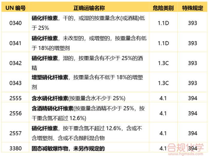 对于退敏爆炸品类的硝化纤维素,根据394的要求,只需符合“试验和标准手册”附录10中Bergmann-Junk试验或甲基紫纸试验标准。