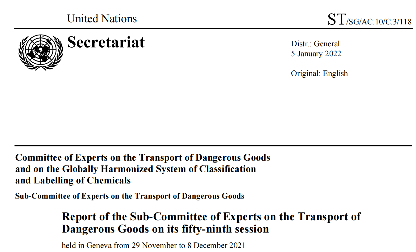 2021年11月29日~12月8日联合国TDG专家委员会第59次会议在日内瓦举行。本次会议的报告也于2022年1月5日正式发布,其中关于为钠离子(Sodium ion battery,简称SIB)新增专用UN编号被写入了联合国TDG法规第22修订版未来修订的草案中,具体内容见会议报告附件1(ST/SG/AC.10/C.3/118/Add.1)的附录2。