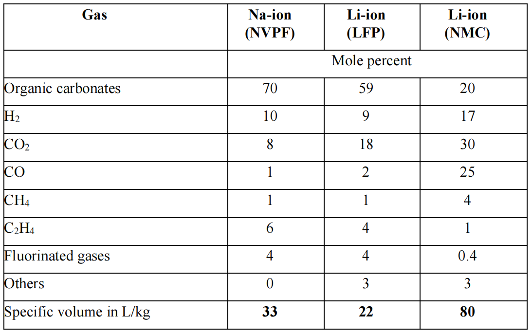 如图4所示,SIB在热失控条件下释放的气体数量与磷酸铁锂(LFP)的LIB类似。这也在一定程度上说明了SIB的运输危险性与部分型号的LIB类似。