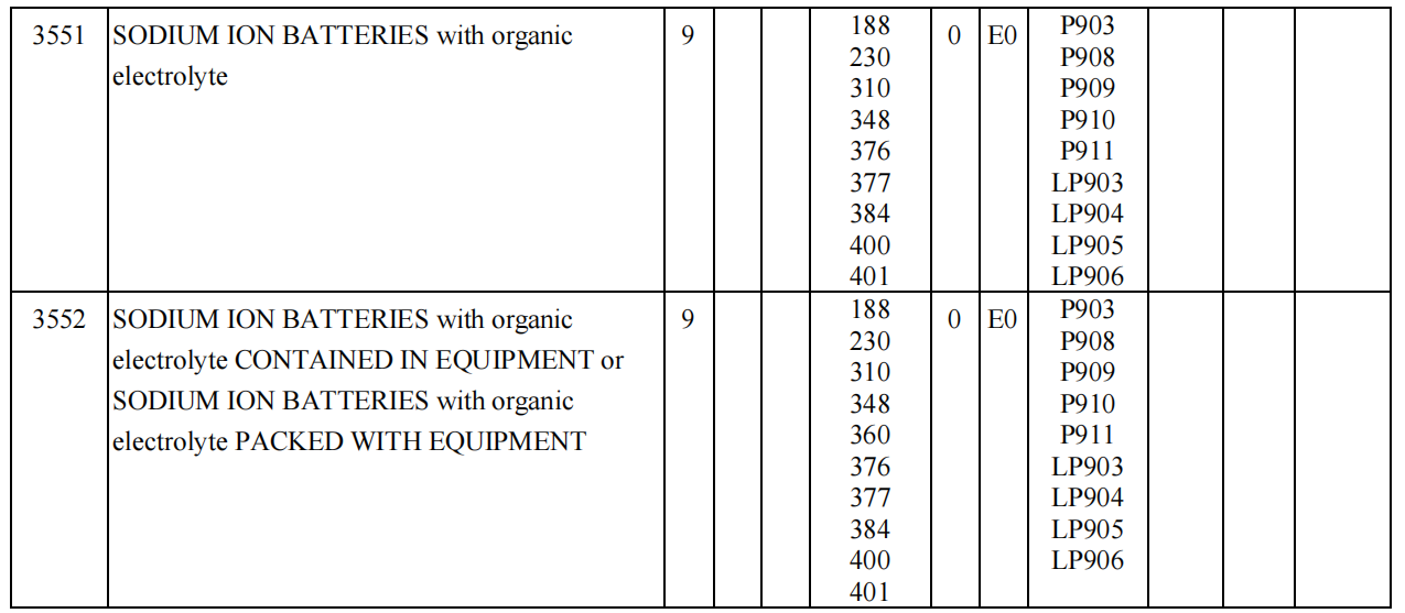 特殊规定401指出了UN3551、3552和UN2795的差异,两者的区别在于电解液,钠离子电池和电池组必须使用有机电解液,后者使用碱性电解液。