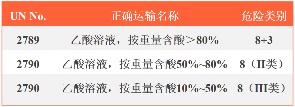 乙酸溶液是联合国TDG法规中列明的危险货物,但是其危险性种类和包装类别会因为乙酸含量的变化而不同。