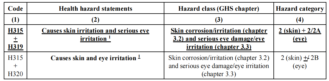 如图4所示,目前GHS制度中有H315+H320的组合危险说明,但由于眼刺激类别2B在部分国家并没有采纳,而类别2通常是被所有国家所采纳的。因此,从实际使用的频率而言,建议新增H315+H319的组合危险说明,适用于皮肤刺激类别2+眼刺激类别2或2A。