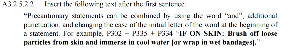 新增A3.1.2.5节,明确除了法规中已经给出来的组合危险说明外,其它组合危险说明也是允许的,只要不同危险说明所表达的危险程度类似或相同,例如:H317+H340+H350,都是危险类别1,而且文字中都有“May cause”,因此从减少标签中文字内容,提供标签的可阅读性,可以进行组合。